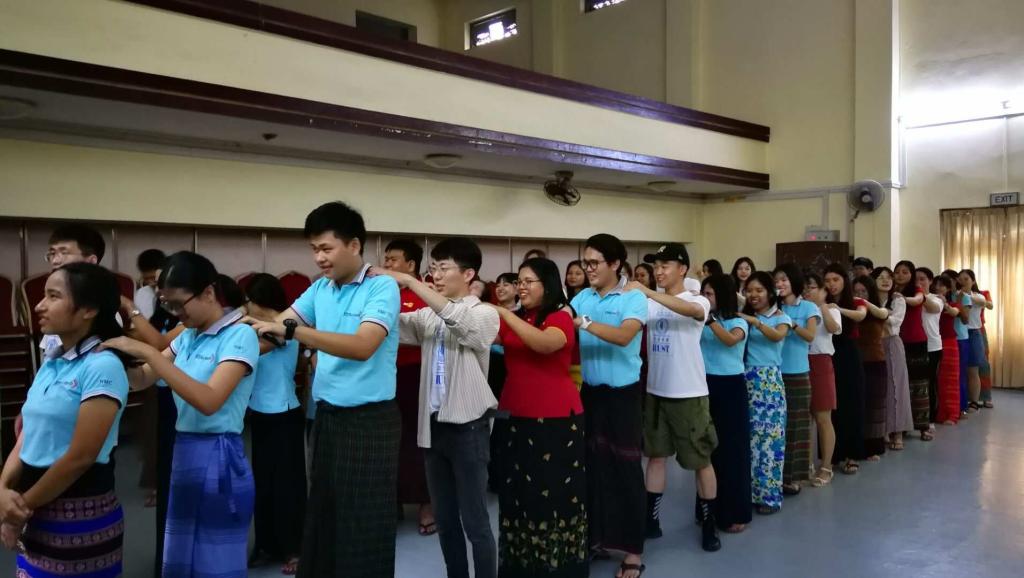 一说起玩游戏大家还是比较拘谨,但在大家通过创意动作的介绍自己后,全场的气氛就被点燃了,为了让自己的名字被记住,大家想出了各种搞怪滑稽的动作,引起了阵阵爆笑。随后,大家玩了猜词语、做指令等简单有趣的集体游戏,中缅同学们相互合作,齐心协力,在游戏的过程中加深了彼此的友谊。