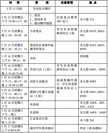 专业面试分为出版专业类、新闻与传播专业类。面试组由该专业挂牌招收硕士研究生的导师组成。面试成绩按统一印发的“复试情况记录表”中所列项目由面试组成员给出。去掉一个最高分,去掉一个最低分后,取平均分为考生的最终面试成绩。