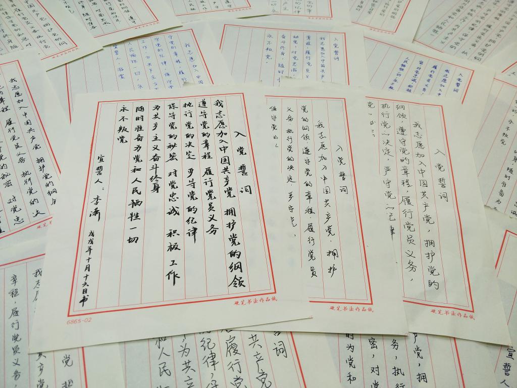 短短二十分钟产生了许多优秀作品,一张张笔迹清秀的入党誓词,不仅仅是书法意义上的佳作,更是表达了各位党员的庄严承诺。在弘扬了中华传统文化的同时,也进一步加深了党员同志对入党誓词理解,使党员牢记自己的入党承诺,勿忘并践行自己曾经宣誓的责任和义务,激励自己在今后的学习和工作中,继承和发扬党的优良传统,不忘初心,继续前行!