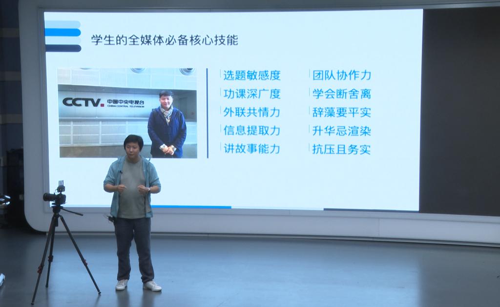 在讲座环节,导演、制片人、“影视小红帽”主理人邵小白作了名为《掌控光影:影视创作心得及实战干货分享》的讲座。讲座分为理论讲解与实战操作两部分。第一部分,邵小白通过互动的方式启发同学们思考新闻传播专业员工应具备的全媒体核心技能,并结合其在创作过程中遇到的具体案例讲述了这些核心技能的应用。