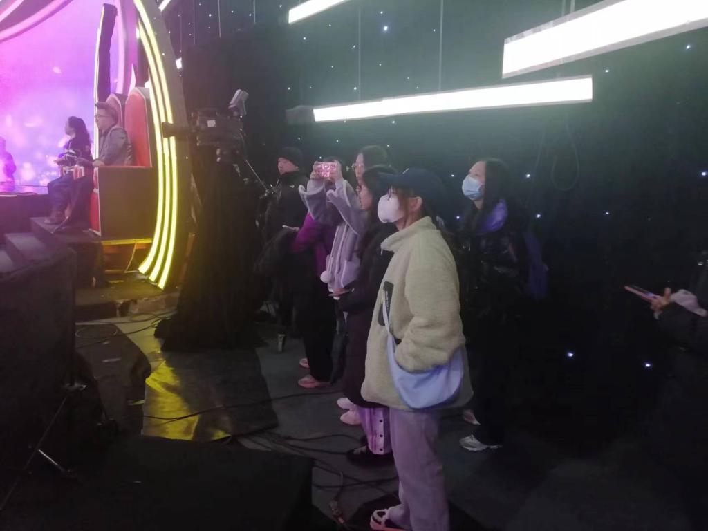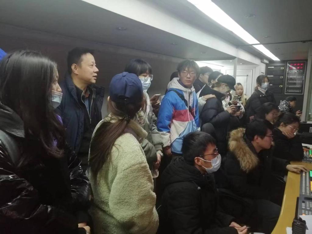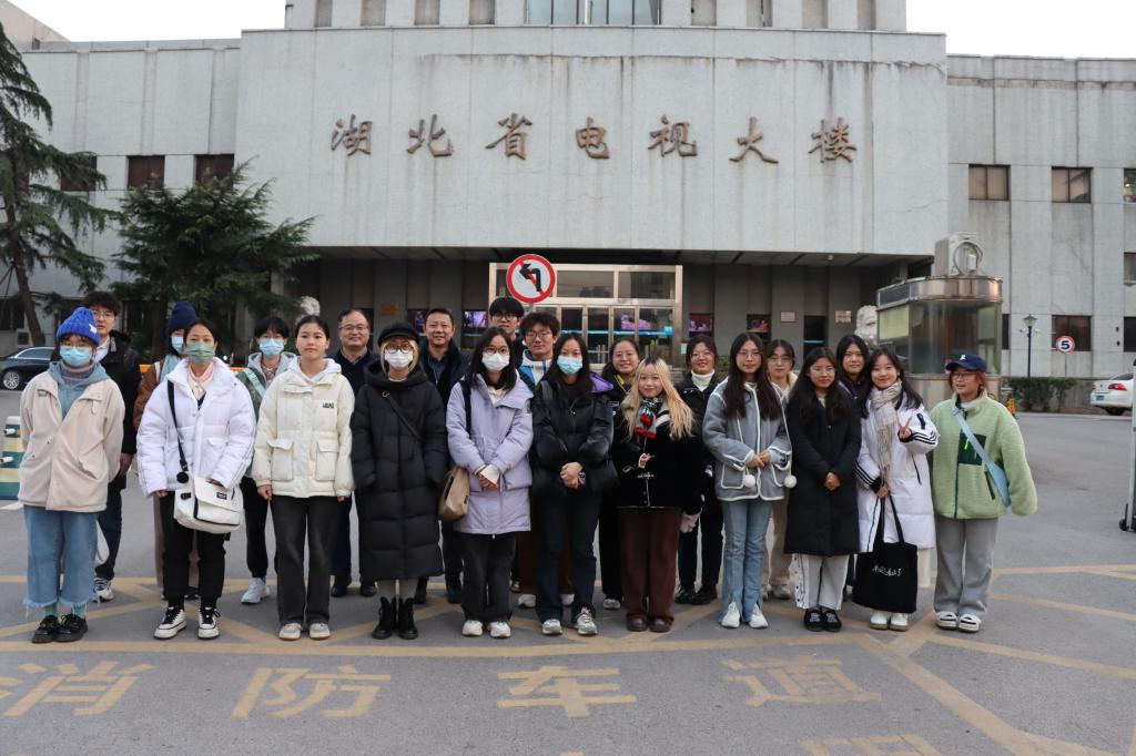 讲座结束后,胡晓凡老师带领工作坊同学们赴湖北广播电视台进行现场参观学习。工作坊同学们走进湖北省电视大楼800平米演播厅,现场观摩了《桃花朵朵开》节目的录制过程,了解了节目录制现场的设备布置、人员配置、工作流程等情况。