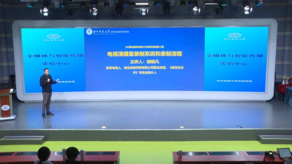 12月24日,JIC新光视界影像工作坊系列讲座第二期邀请资深电视人、湖北经视传媒有限公司副总经理、《桃花朵朵开》节目总制片人胡晓凡来到威廉希尔足球官网演播厅,为工作坊同学们作了题为《电视演播室录制系统和录制流程》的讲座。