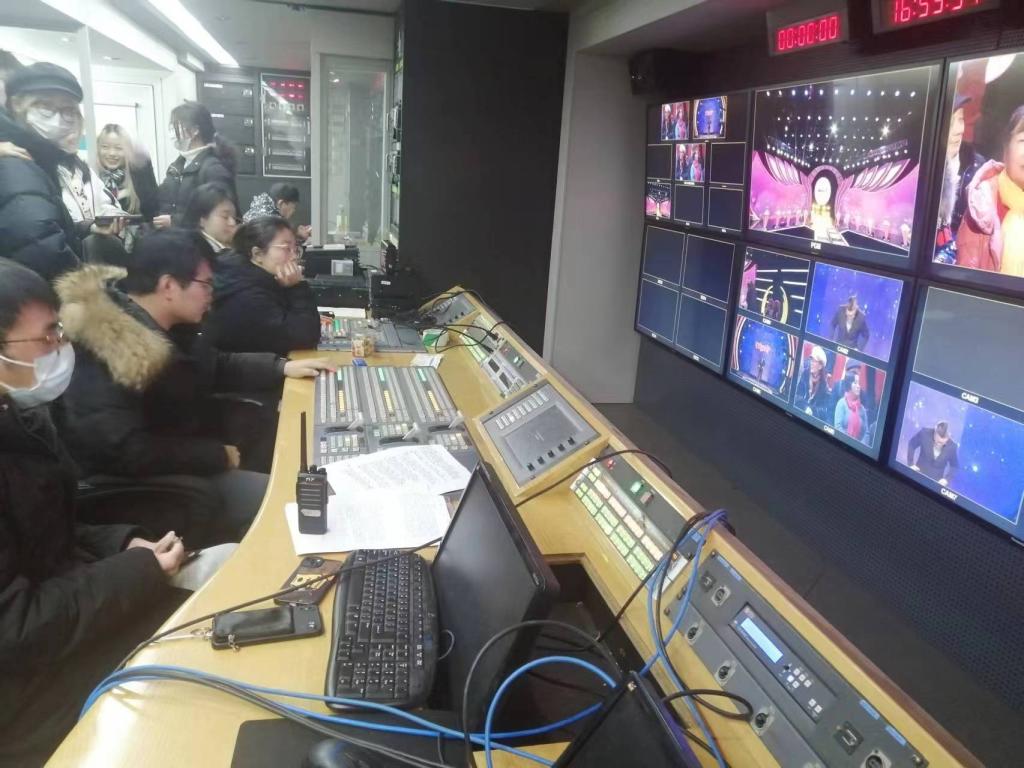 最后,胡晓凡老师带领工作坊同学们登上电视转播车,观摩《桃花朵朵开节目》节目的现场切播过程,了解节目播控的工作流程、人员分工以及播控工作需要注意的问题。