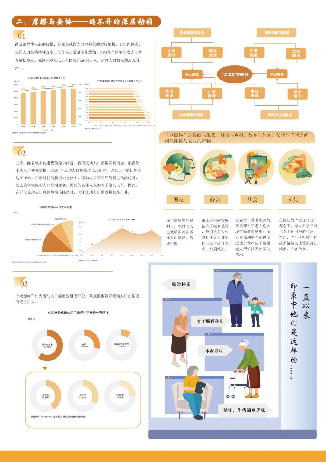 作品聚焦在社会语境中被忽视的“老漂族”群体,在严谨调查分析的基础上,力求展现人文关怀。在数据挖掘方面,于最大范围内搜集整理全域信息,从多维度进行全面分析,历时五个月时间,提炼30余篇期刊论文,20余份专业报告,5万余字新闻报道,并佐以实地采访,增加作品的人文关怀。在可视呈现部分,团队使用8种工具,制作了10种类型、共26张图表,并设计了13种手绘元素符,嵌入形象化插图,利用视觉符号传递情感。最终,作品凝练为为5张信息海报,视觉冲击力强,信息传递简洁直观,极大助益了传播推广。作品在澎湃新闻客户端发表后,一举冲上“有数指数榜”,获得热烈反响。