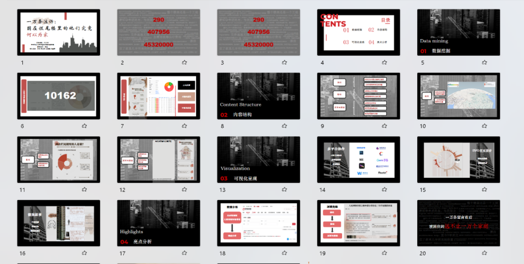 可视化方面,作品统一为简洁有温度的电子报刊风格,坚持数据驱动和技术支持的原创可视化呈现,首次提出了“星空图”和“绣球图”的原创可视化设计,还对蝴蝶图、热力图、多级环图等多种基础图表进行变形,以适应数据的实际需求。