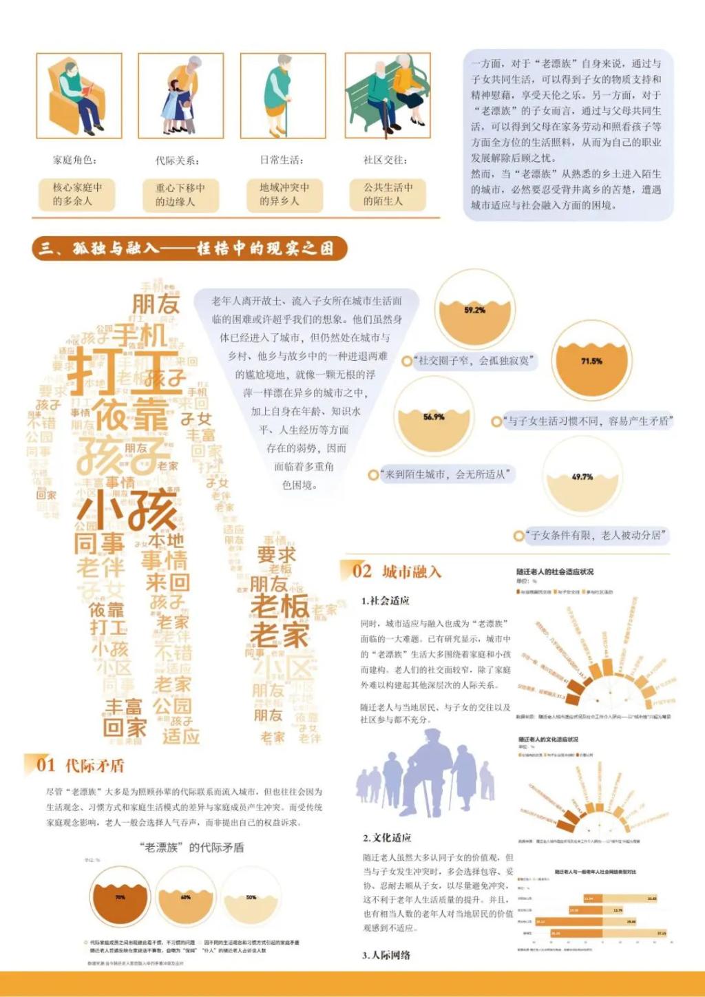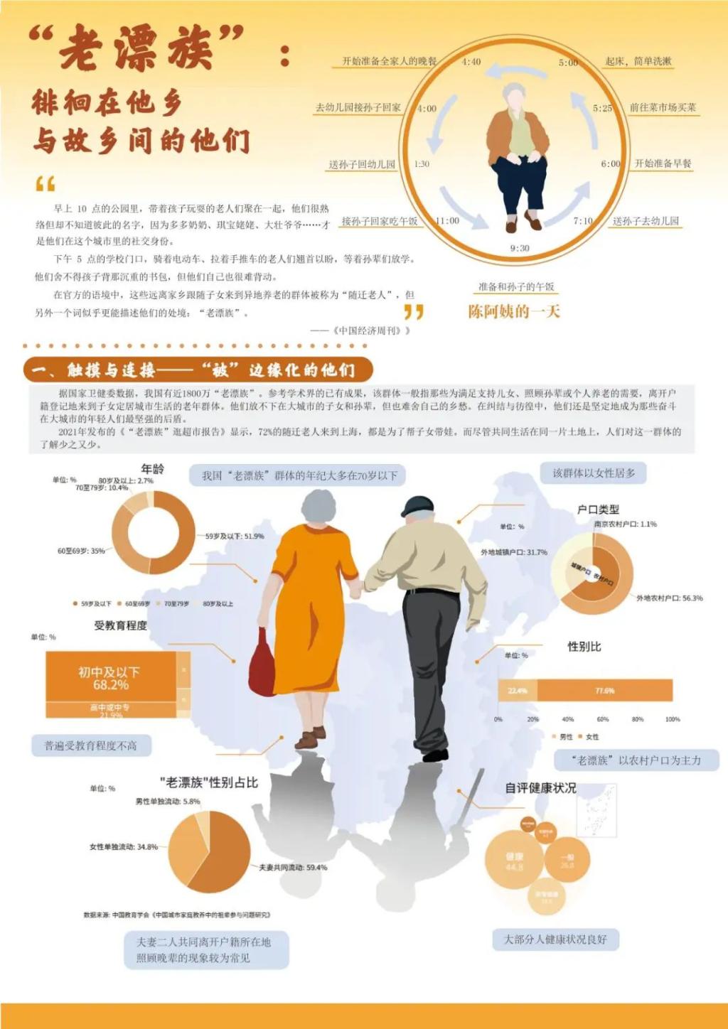 中国流动人口规模近4亿,60岁及以上人口总量近3亿。五年前,中国的随迁老人数量已超1800万。在这一背景下,作品围绕“老漂族”,通过群体画像、深层动因、现实困境和未来展望四个部分展开,揭示这一群体的生存现状,反映他们“空巢在家”和“漂泊异乡”之间的两难选择,呈现中国社会转型和城市化进程的缩影。