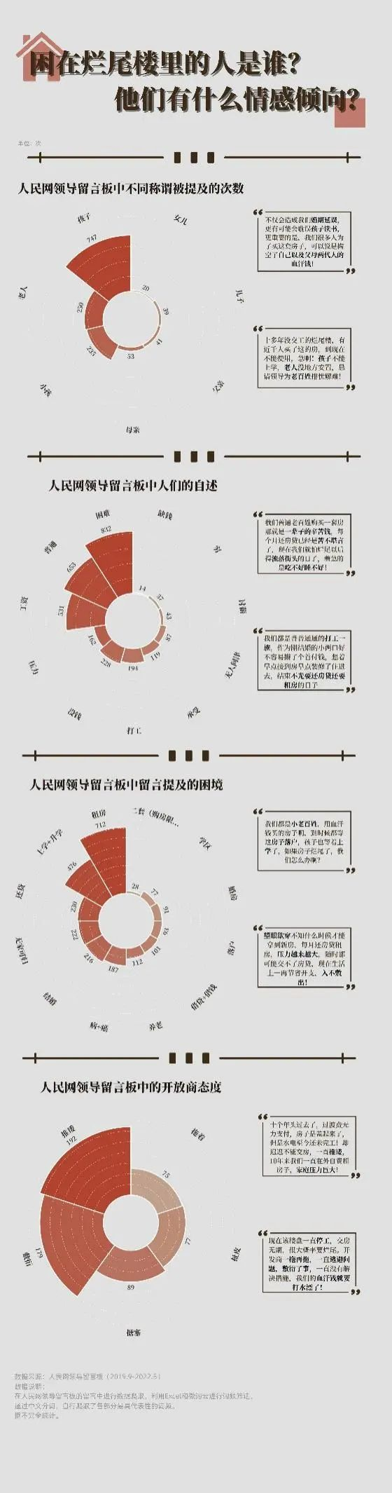 本作品以网站和微信推文双途径呈现,选取人民网领导留言板作为主要信源端,从中提取了10162条涉及“烂尾”的留言,于海量文本中凝塑烂尾楼业主的真实诉求。作品对烂尾楼的现状、影响、成因与解决措施逐一展开细致分析。不仅在宏观上呈现烂尾楼分布地域和占地区划,将数值形式的烂尾率进一步具象可视化,而且在微观上聚焦业主情绪波动态势,挖掘情感特征文本。除此之外,作品还追溯了烂尾楼形成的深层症结,梳理各方共同发力解决困局的重要举措。