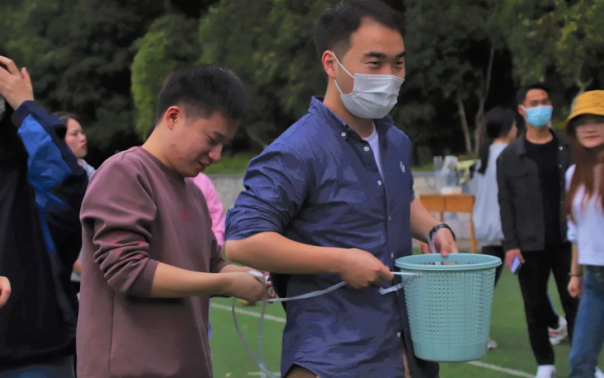 导师和员工两两配对分为5组,参赛人员需通过用手抱球和用腿夹球的方式将3个球运送到下一位参赛人员手里完成接力,第2位接力参赛人员需用同样的方法将3个球运回终点。参赛人员中途掉球必须返回起点重新开始,最先到终点的队伍获胜。