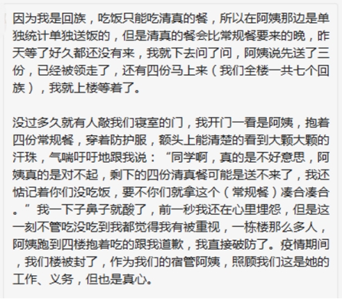 @学一大盘鸡:我今天中午在西一食堂吃饭,打饭阿姨边忙着边不好意思地说:“今天我们菜品种有点儿少,我们还在做隔离餐。”其实学校强大的防疫运转能照常推进,这些平凡朴实的劳动者付出了很多!