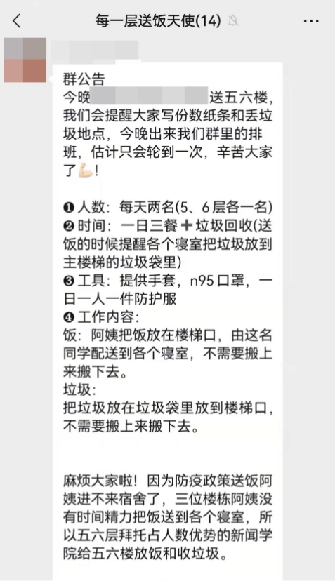 作为楼栋的主要负责学院,我们威廉希尔足球官网的员工牵头,在学校要求不能由楼外人员上楼配送三餐后,主动承担配送和收垃圾工作,为阿姨减轻负担,带动其他学院也安排楼层负责人协助工作。