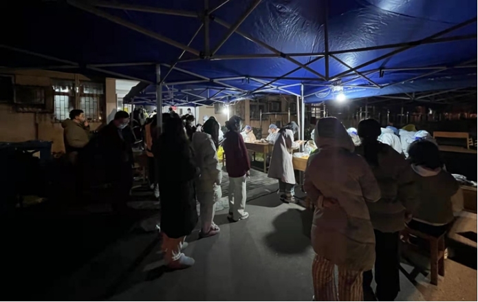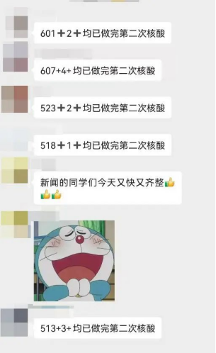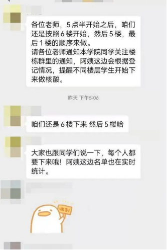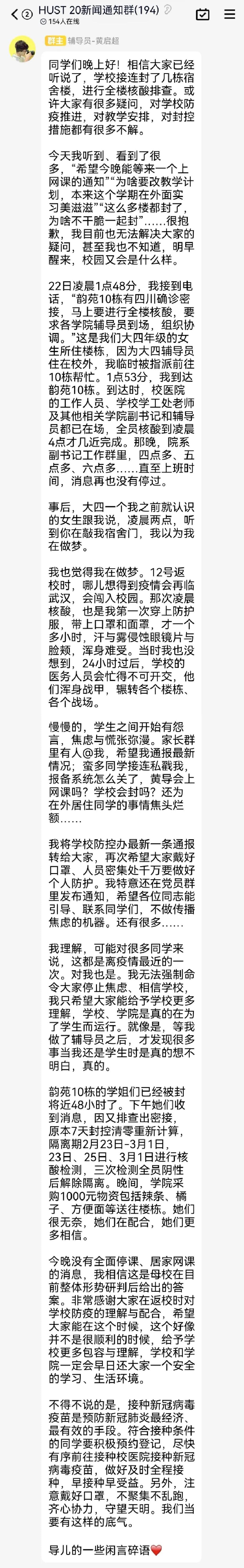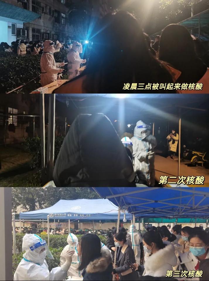 @喻家山小可爱:在韵苑10栋,2月22日晚,是一个不眠之夜。从凌晨1点到4点,大家在有序做核酸,都没有抱怨,有些同学还帮助辅导员统计登记人数。李彬彬副书记凌晨1点就到10栋楼下陪着大家,虽然只有一门之隔,但一直陪着大家做完核酸。而且黄启超老师还穿着防护服跑到五楼六楼一个个敲门,真的好辛苦!!