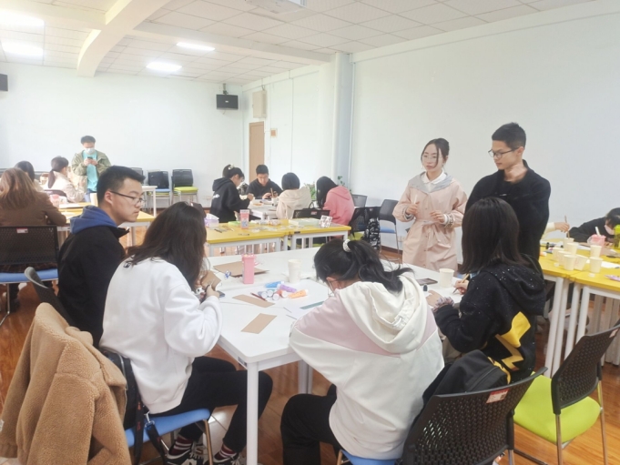 活动开始,主持人熊泽心将同学们分为三个小组,每一组围坐在一张大桌子周围,每一张桌子上都堆放着各式各样的手工书签材料,只等同学们发挥自己的创意和动手能力,制作出一个个精美的书签。