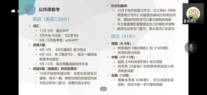 交流会开始,学院18级郭宇龙、王馨涓、陆伟文、陈一萌、周颖及17级蔡晓然同学依次分享,从院校选择、时间安排、各科经验、心态调整等多个角度进行阐述。他们中有考研至清华、复旦的同学,也有考研至本校且复试、综合成绩排名遥遥领先的同学,还有跨专业考研至本校经济学院的同学。他们用亲身经历向同学们输出了满满干货:考研的真正诉求、个人情况的分析、准备过程中出现的问题与挫折、具体的备考技巧......