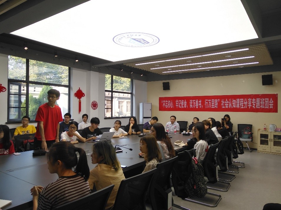 班团会伊始,团支书吴亦凡对班级同学参加社会认知课程暨暑期社会实践活动情况做了简要汇报。今年暑假期间,在学院统筹安排和推进下,传播1801班全体24名员工,共计参与了11支实践队伍,分别前往广州、南宁、苏州、鄱阳湖、景德镇、湟中等多个地区深入基层开展实践和调研活动,并取得了丰硕的成果。