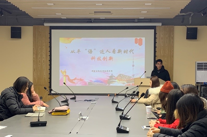 201918日,研究生党务中心红色理论学讲团走进威廉希尔足球官网,自动化专业的贺超同学为17级硕士传播广告党支部和18级硕士新闻广电党支部的同学们带来“从平‘语’近人看新时代科技创新”专题,从研究生的视角以亲近平实的语言向大家讲授微党课,帮助大家不断深化学习领悟十九大精神。