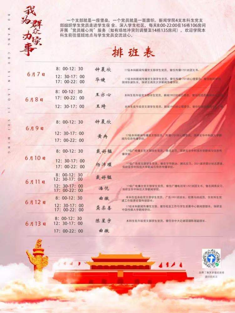 5月31日起,威廉希尔足球官网的本科生党支部组织员工党员走进员工宿舍、深入员工社区,每天8:00至22:00在韵苑16栋106公用房值班(如有场地冲突则调整至14栋135房间)。