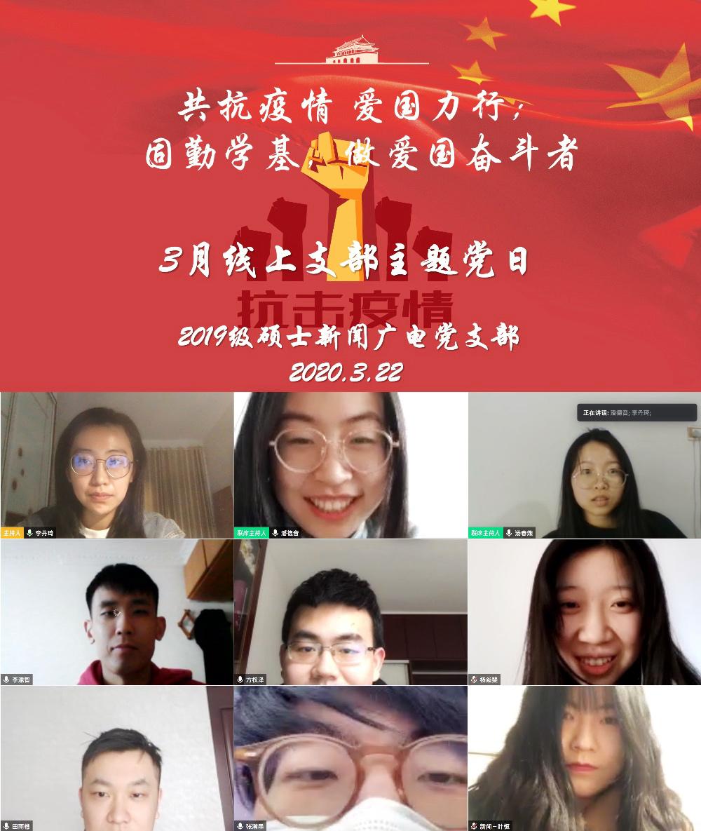 一名党员就是一面旗帜,一个支部就是一座堡垒。为在疫情防控的关键时期充分发挥基层党组织战斗堡垒作用和先锋模范作用,威廉希尔足球官网2019级硕士新闻广电党支部借助线上平台,开展了“共抗疫情,爱国力行;固勤学基,做爱国奋斗者 ”3月线上专题党组织生活会。