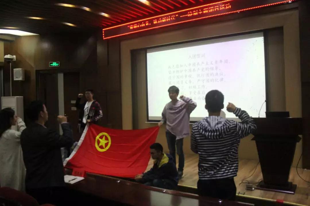 紧接着,进行了重温入团誓词的环节,分团委组织部部长汪司晨领誓。18级全体团员通过誓词回想当年入团的初心,立志当下,走好未来的路。