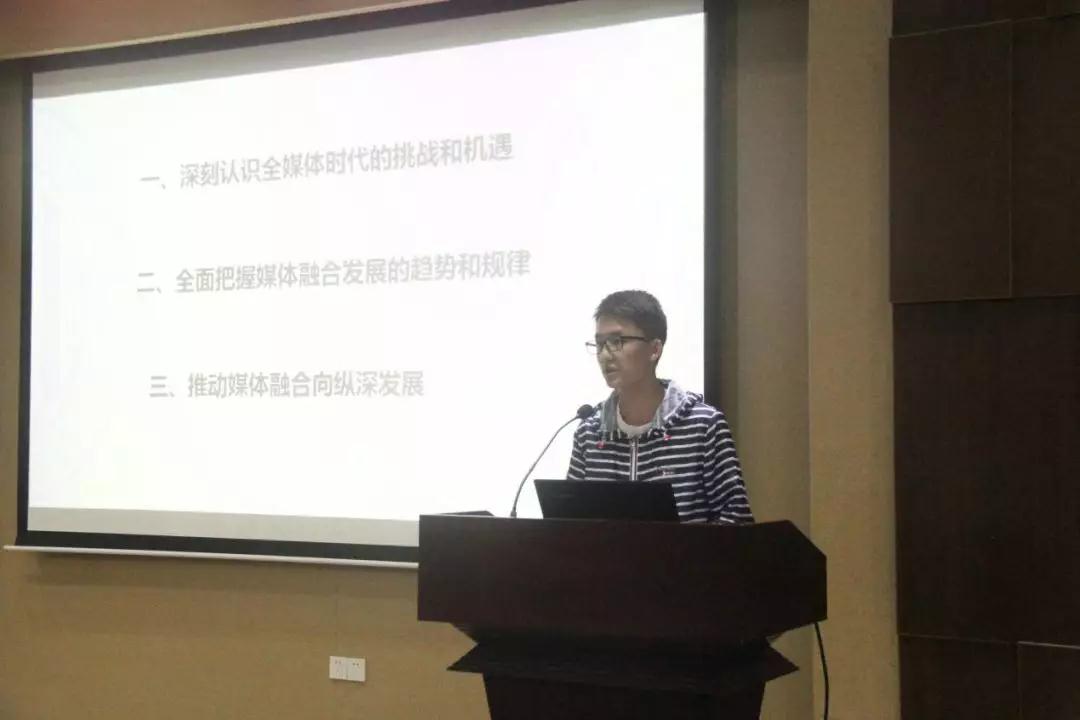 接下来,青年宣讲队成员汪司晨为大家带来的学“习”时间。他对习近平总书记的重要文章(《加快推动媒体融合发展 构建全媒体传播格局》)进行了深刻解读,并结合新闻专业实际,号召同学们做衡量正误的标尺、反映时代的明镜、光照四方的灯塔。